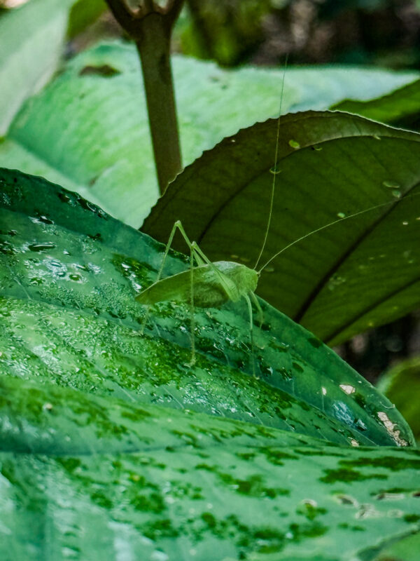 Description: En el corazón del histórico Camino de Cruces de Panamá, durante una jornada de reforestación, me encontré con este pequeño cantante: un grillo verde posado en una hoja verde. La ironía flotaba en el aire: para sembrar árboles, se había cortado una hierba invasora —una versión modificada de la caña de azúcar— tan resistente que amenaza con desplazar a la vegetación nativa. Al removerla, el suelo vibraba con vida: cienpiés, grillos y otros habitantes olvidados emergían del follaje cortado, buscando refugio. Entre todos, fue el canto del grillo lo que más me marcó. Invisible a simple vista, pero imposible de ignorar si se escucha con atención. En medio del crujir de hojas, su trino parecía recordarnos que el bosque aún tiene voz… Un símbolo de resiliencia, de belleza camuflada, y de cómo incluso lo más pequeño canta con fuerza cuando se le escucha.