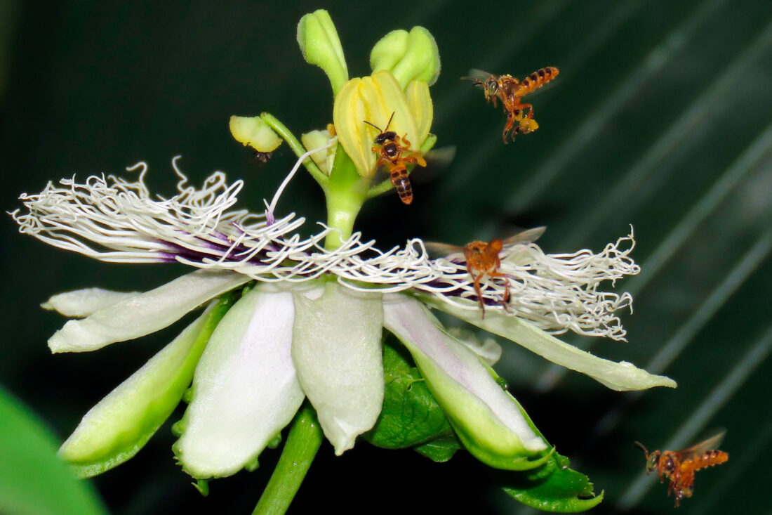 Description: Abejas sin aguijón Tetragona visitando flor de maracuyá, principalmente para colectar polen. Mientras colectan dicho recurso, involuntariamente polinizan la flor, logrando la formación de los frutos. Las abejas sin aguijón son importantes polinizadoras de una gran variedad de frutos en los trópicos, haciendo una valiosa contribución a la alimentación humana