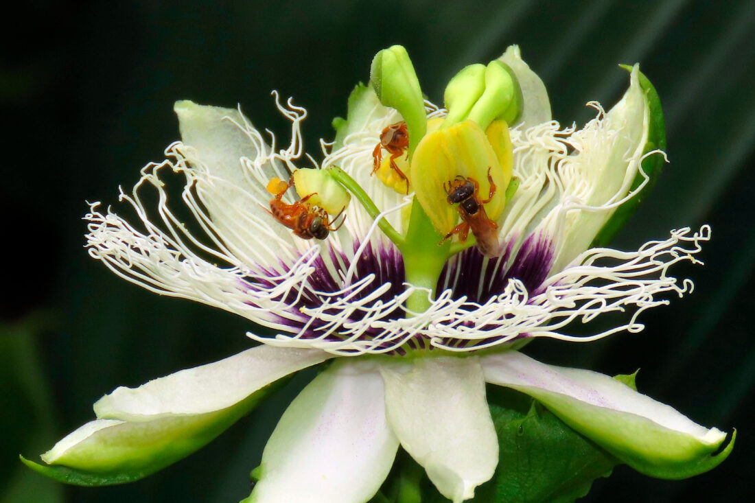 Description: Abejas sin aguijón Tetragona colectando polen en los estambres de una flor de Maracuyá. Mientras colectan dicho recurso, involuntariamente polinizan la flor, logrando la formación de los frutos. Las abejas sin aguijón son importantes polinizadoras de una gran variedad de frutos en los trópicos, haciendo una valiosa contribución a la alimentación humana, algo que ´por desgracia, es frecuentemente ignorado.