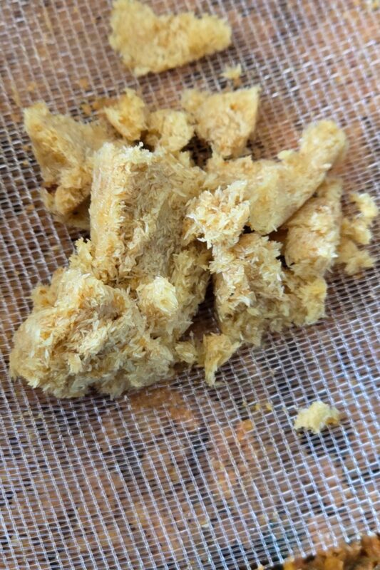 Description: La imagen muestra un conjunto de huevos de Hermetia illucens en una superficie seca de madera, justo antes de su eclosión, como lo indica su coloración amarilla intensa. Estos fueron colocados estratégicamente sobre una base alimenticia inicial, donde permanecerán por aproximadamente cinco días. Luego, post 5-DOL, las larvas serán transferidas a bandejas de alimentación con residuos orgánicos. Esta etapa marca el inicio del ciclo de bioconversión, donde los insectos comienzan a transformar materia orgánica en biomasa útil, jugando un papel importante en la gestión sostenible de residuos y la producción de proteína alternativa.