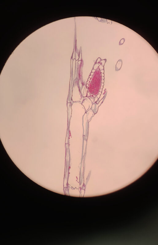 Description: A simple vista, las gramíneas parecen modestas, pero bajo el microscopio revelan una arquitectura floral sorprendente. Esta imagen muestra una sección longitudinal de una diminuta flor de la familia Poaceae, donde se aprecian con detalle el ovario, los óvulos y las estructuras reproductivas de una planta común, pero crucial para la vida en la Tierra. Esta fotografía resalta la elegancia escondida en lo cotidiano, y nos invita a redescubrir la botánica desde otra perspectiva: la del asombro científico.