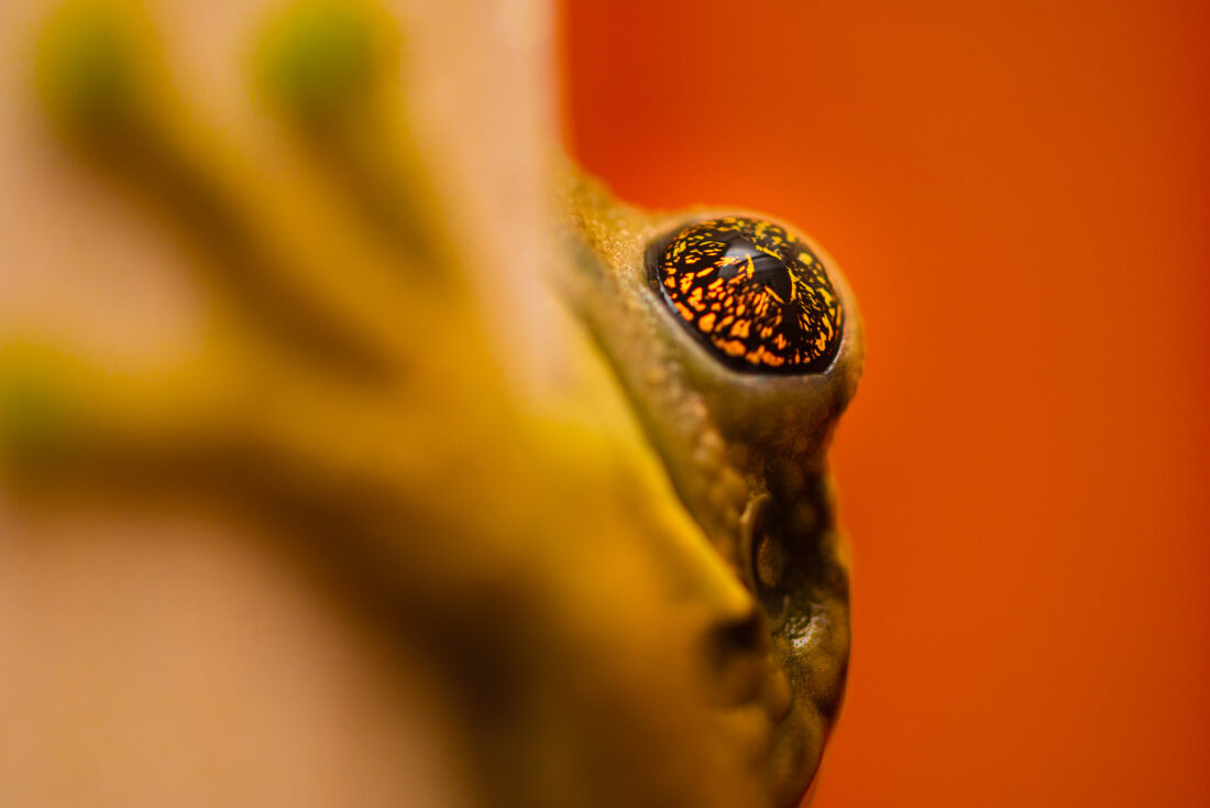 Description: En el corazón de Las Tablas, esta rana arborícola nos recuerda que aún hay vida vibrante y misteriosa esperando ser descubierta. Su ojo, como un vitral natural, refleja la memoria viva del bosque. Cuidar su hogar es también cuidar el nuestro.