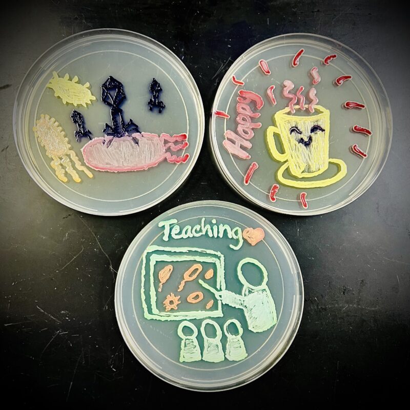 Description: Esta imagen es parte de la trilogía “Things that make me happy: Microbiology, teaching and coffee”, creada utilizando medios de agar nutritivo y CHROMagar como lienzo. El arte fue realizado con bacterias y levaduras pigmentadas de manera natural: Chromobacterium violaceum, Serratia marcescens, Micrococcus luteus, Candida albicans y Rhodotorula, que aportan la paleta de colores de forma viva y genuina. La trilogía representa tres fuentes de felicidad personal. Este trabajo participó en el Agar Art Contest 2024 de The American Society for Microbiology (ASM) y fue seleccionado entre los 15 mejores a nivel mundial en la categoría Creators. Concepto y ejecución: Stephany Young Yusty