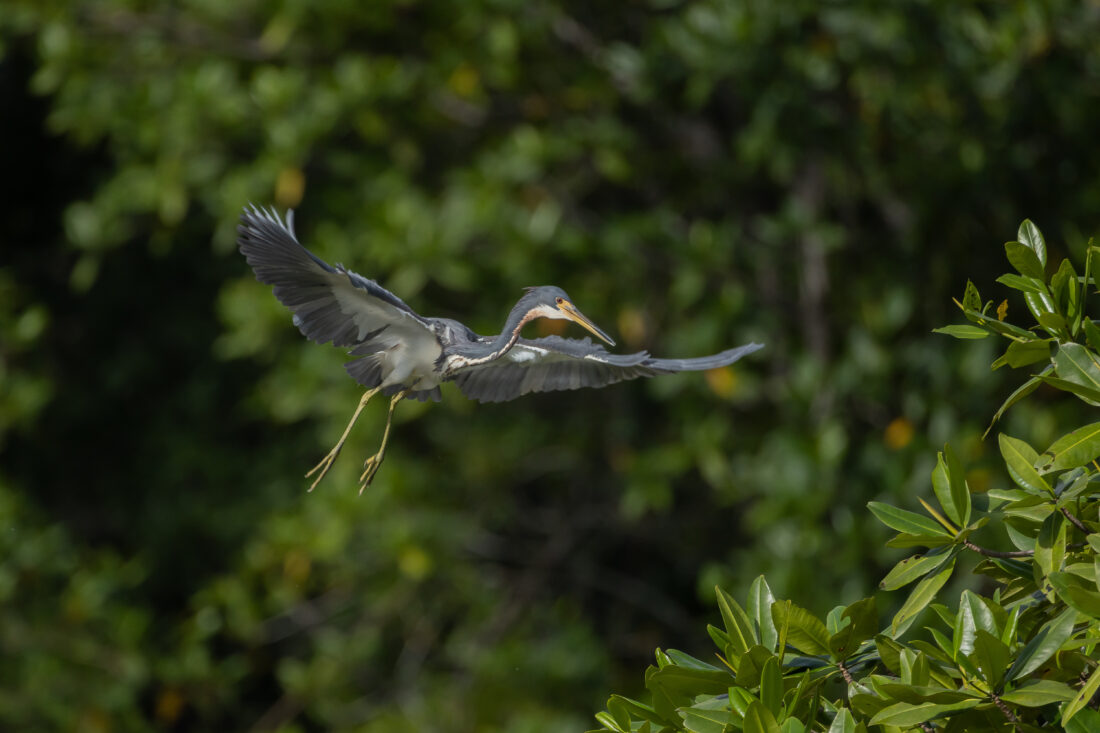Description: Una garza tricolor (Egretta tricolor) forrajea y vuela libremente entre los manglares a las orillas de uno de los ríos de Puerto Lara, Darién, mientras un grupo de observadores de aves participaban de un conteo navideño de aves.