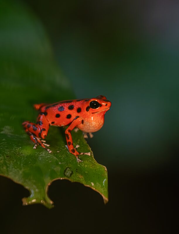 Description: Sobre una hoja húmeda en la selva de Isla Bastimentos, este pequeño macho de Oophaga pumilio, conocido como "red frog", emite su canto de apareamiento. Esta especie de rana venenosa es endémica del Caribe panameño, y en Bastimentos ha desarrollado un color rojo intenso con manchas negras, resultado de un fenómeno evolutivo llamado polimorfismo de color. Cada isla alberga poblaciones con tonalidades únicas, verdaderas joyas de la biodiversidad insular. Esta rana no solo da nombre a una de las playas más emblemáticas de la isla, sino que representa la riqueza natural de Bastimentos. Sin embargo, su supervivencia depende de la conservación de los bosques húmedos que habita, hoy amenazados por el crecimiento turístico. Capturar este momento fue un recordatorio de que proteger a este pequeño tesoro es preservar una historia evolutiva irrepetible y el frágil equilibrio de un ecosistema único.