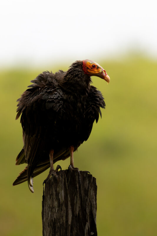 Description: Esta foto la tomé en la carretera que conduce a la Playa Las Lajas, que es uno de mis lugares favoritos para ir en búsqueda de aves rapaces. La imagen muestra a un gallinazo cabeciamarilla menor posando sobre un poste de cerca. Aunque para muchos no sea un ave "bonita", al verla de cerca, con sus texturas y colores al detalle, nos recuerda que cada parte de su apariencia cumple una función vital en su nicho ecológico. Su cabeza desnuda evita que restos de carne y fluidos se adhieran mientras se alimenta, lo que facilita su higiene. Sus ojos grandes le proporcionan una visión excepcional, necesaria para detectar alimento desde grandes alturas. Su plumaje negro absorbe el calor solar, ayudando a desinfectar sus plumas al "cocinar" las bacterias presentes en la carroña. Cada rasgo, lejos de ser arbitrario, está finamente ajustado para cumplir su rol en el complejo equilibrio de los ecosistemas que habita.