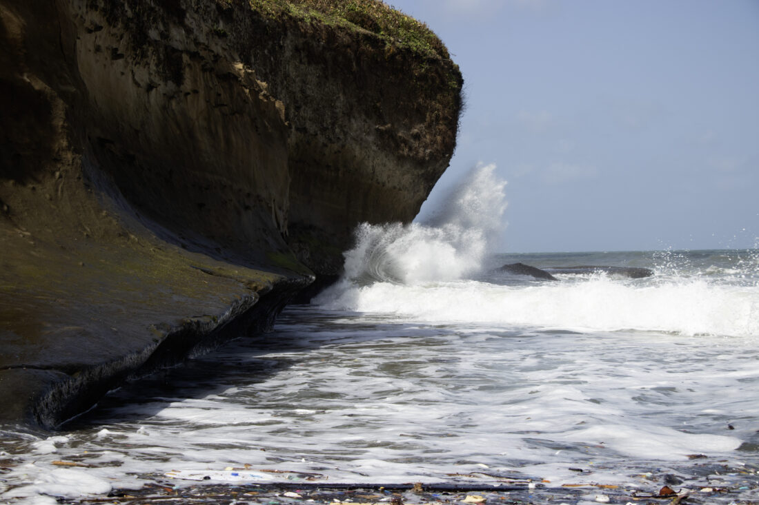 Description: Costa Abajo de Colón. Esta formación rocosa, pertenece a la Formación Chagres uno de los sitios mas diversos para recolectar fósiles de vertebrados en la costa Caribe panameña, sin embargo, la mayor parte de año las olas esculpen el paisaje natural, dando paso a formas antojadizas y resquebrajando la roca. Por otro lado, y por irónico que parezca la belleza natural se empaña por el desperdicio humano, en la foto se puede ver las cantidad de tapas plásticas, mangos de cepillos de dientes y un sin numero de otros objetos plásticos, testigos mudos de su paso por el agitado mar y el va y ven de las olas.