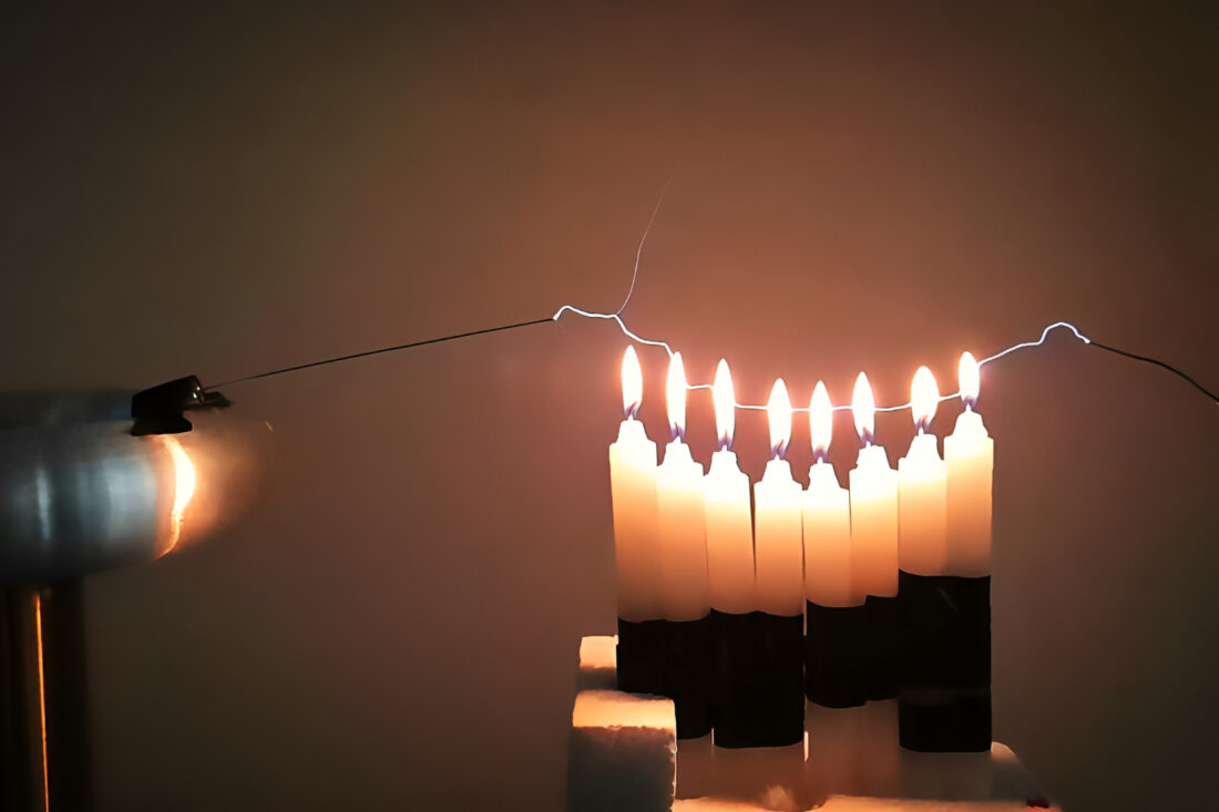 Description: La imagen muestra un experimento científico en el que la descarga eléctrica proveniente de una bobina de Tesla se conduce a través de un camino formado por llamas de velas. Se observan varias velas alineadas, cuyas llamas están interconectadas por finos arcos eléctricos visibles en medio de un tenue resplandor, demostrando la capacidad del fuego y de la pluma de calor para actuar como medio conductor. A la izquierda, la bobina de Tesla, parcialmente visible, genera la descarga que salta de llama en llama hasta alcanzar el extremo opuesto del montaje. El fondo oscuro realza el contraste entre el brillo cálido de las velas y la luminosidad fría de los arcos eléctricos, creando una escena visualmente impactante que combina física, ingeniería y arte. The image depicts a scientific experiment in which the electrical discharge from a Tesla coil is conducted through a pathway formed by candle flames. Several aligned candles can be seen, their flames interconnected by fine electric arcs visible as a faint bluish glow, demonstrating the ability of fire and the thermal plume to act as a conductive medium. On the left, the partially visible Tesla coil generates the discharge, which jumps from flame to flame until it reaches the opposite end of the setup. The dark background enhances the contrast between the warm glow of the candles and the cool luminosity of the electric arcs, creating a visually striking scene that blends physics, engineering, and art.