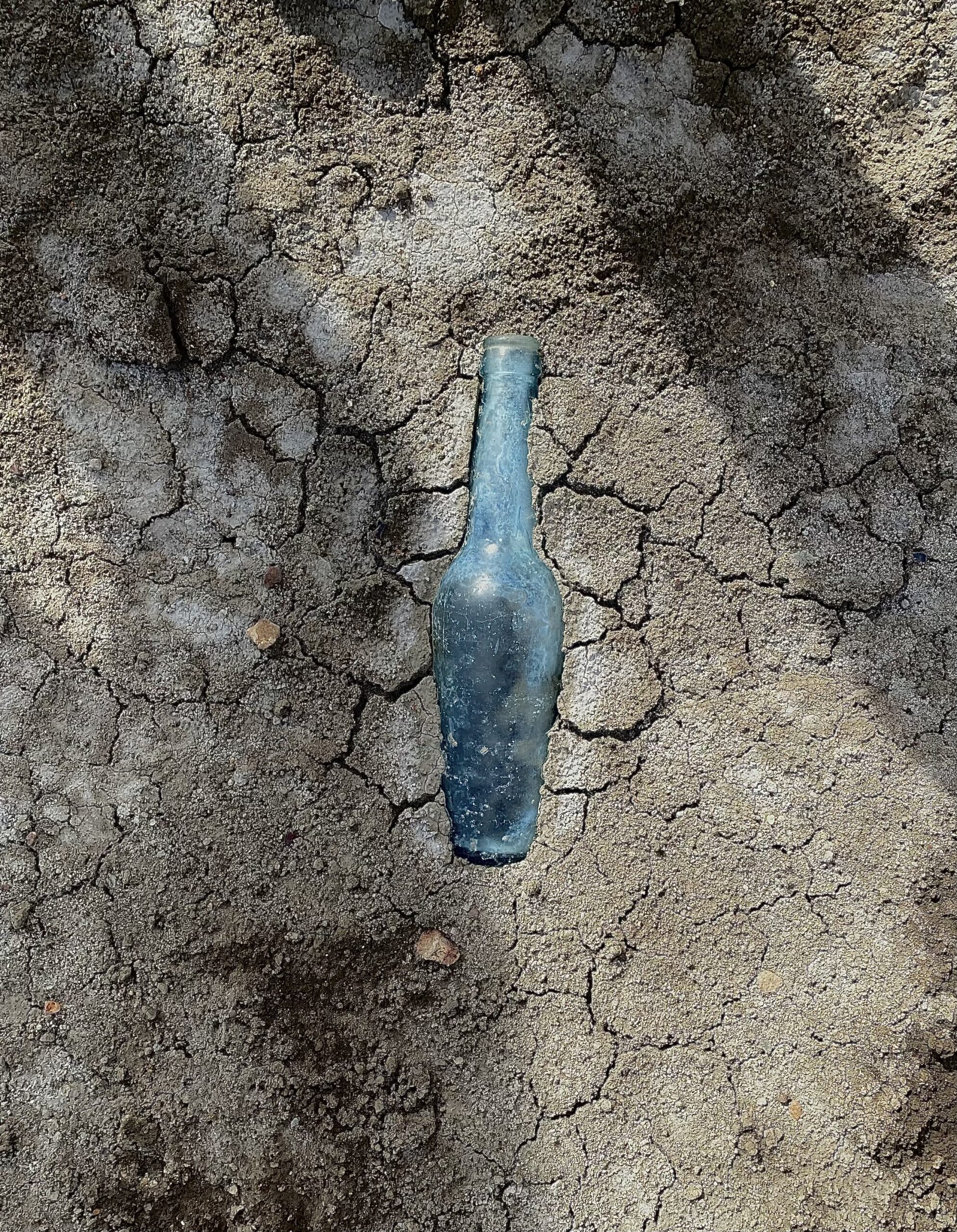 Una simple botella olvidada yace sobre la tierra reseca y agrietada, como un eco silencioso del impacto humano.
