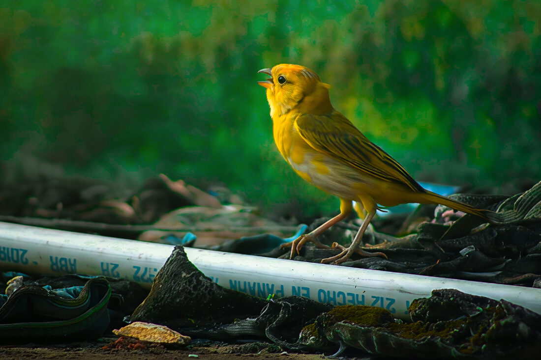 Description: El canto de un canario silvestre (Sicalis flaveola) se eleva desde un rincón invadido por basura, trapos y tuberías humanas. Entre el verde que resiste, su figura vibrante contrasta con el abandono que lo rodea. Su presencia lanza una pregunta silenciosa: ¿a dónde fue lo que le pertenecía?