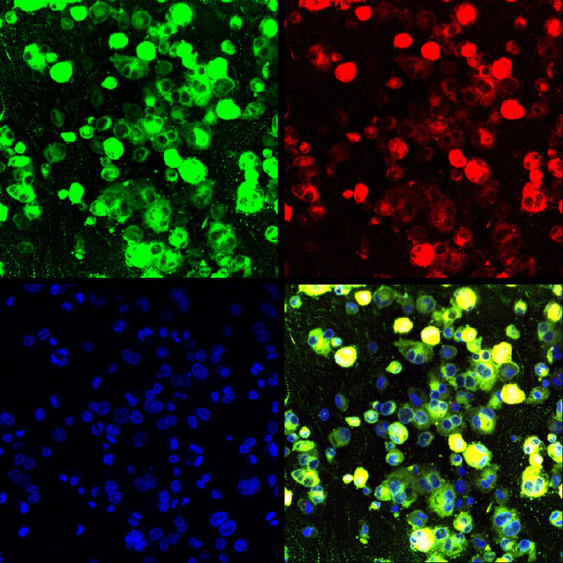 Description: Composición de imagen, obtenida mediante microscopía láser confocal Leica SP5 a 63X que revela cómo el fármaco fluorescente se acumula intensamente dentro de macrófagos humanos, colocalizándose claramente (amarillo) en los parásitos intracelulares Leishmania. Los núcleos azules destacan la estructura celular, mostrando en detalle esta interacción vital para la terapia leishmanicida.