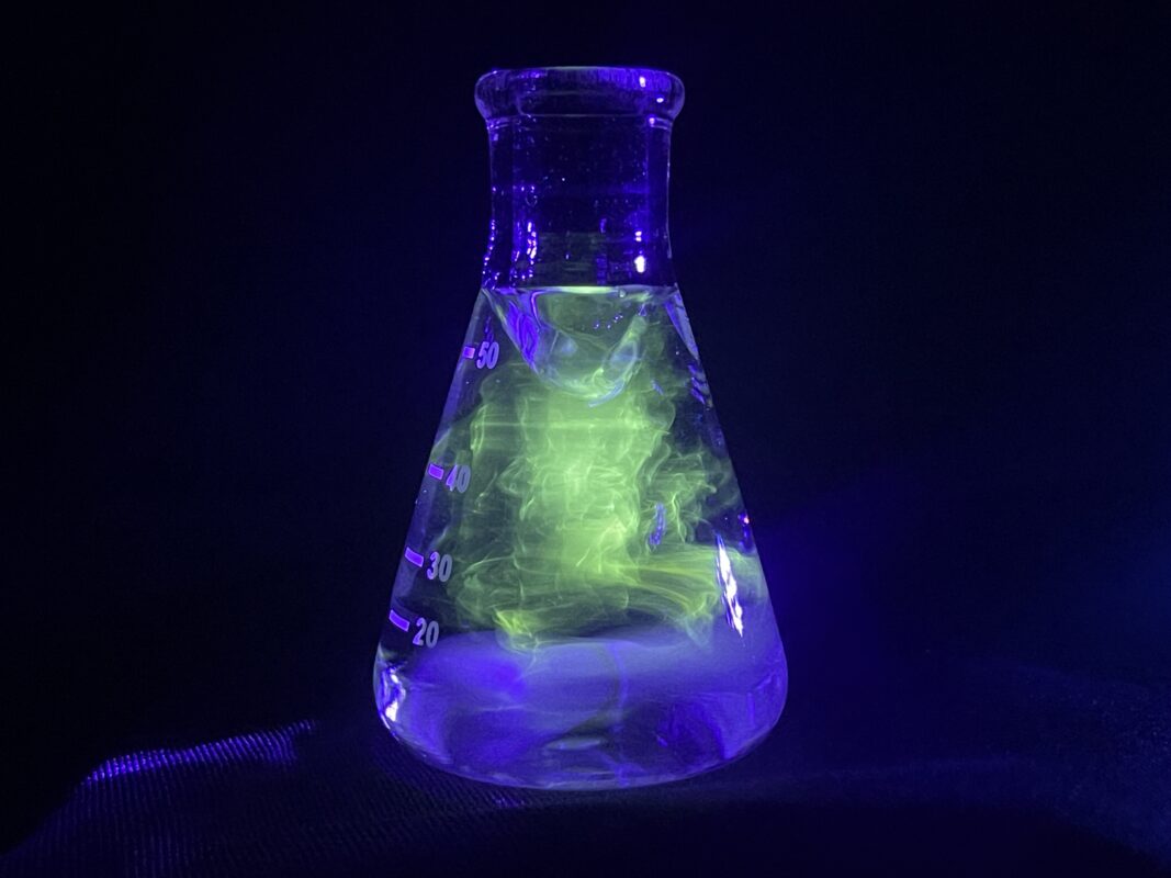 Description: La fotografía muestra una mezcla de puntos cuánticos de carbono siendo agitada magnéticamente en un matraz. Estos fueron sintetizados utilizando urea y ácido cítrico como precursores. Los puntos cuánticos, o quantum dots en inglés, son nanocristales semiconductores, con tamaños que oscilan entre 1 y 10 nanómetros, y poseen propiedades ópticas y electrónicas únicas debido al fenómeno de confinamiento cuántico. Se ha descubierto que los puntos cuánticos pueden actuar como sensores químicos y biológicos. Entre sus aplicaciones destacan la detección de células cancerígenas, el seguimiento de fármacos y la localización de biomoléculas en tejidos vivos. Su utilidad como sensores se debe a que su fluorescencia varía en respuesta a estímulos como iones metálicos, cambios de pH o biomarcadores específicos.