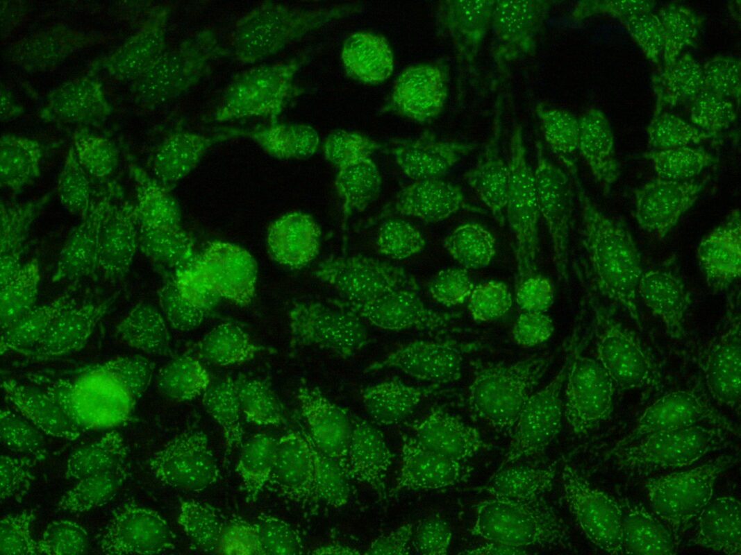 Description: En condiciones normales nuestro sistema inmunológico nos protege de infecciones, microorganismos u otras sustancias extrañas, pero cuando los mecanismos que distinguen entre lo propio de lo extraño fallan, nuestro sistema produce anticuerpos o células inmunitarias que atacan por error a nuestras células o tejidos del cuerpo. Esto nos lleva a tener una enfermedad autoinmune lo que causa una variedad de síntomas y problemas de salud. Las causas exactas son complejas y a menudo desconocidas. Se cree que una combinación de factores genéticos, ambientales e incluso hormonales puede jugar un papel en su desarrollo. Sustrato: Células HEP-2 Método: Inmunofluorescencia Indirecta (IFI) Microscopio utilizado: Nikon Eclipse Ci-L (Microscopio de Luz Polarizada) Nikon Digital Sight DS-Fi2 40X
