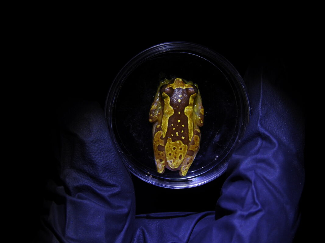 Description: La fotografía muestra una rana reloj de arena amarilla (Dendropsophus ebraccatus) cuyo patrón dorsal es la razon de su nombre, aquí se muestra este anfibio en un pequeño plato petri que utilizamos para mantenerla inmóvil y tomar su peso en una balanza digital y evitar su escape, esto como parte del proyecto de investigación que lleva nombre: Diversidad y Comparación de Poblaciones de Anfibios del Parque Nacional Soberanía.