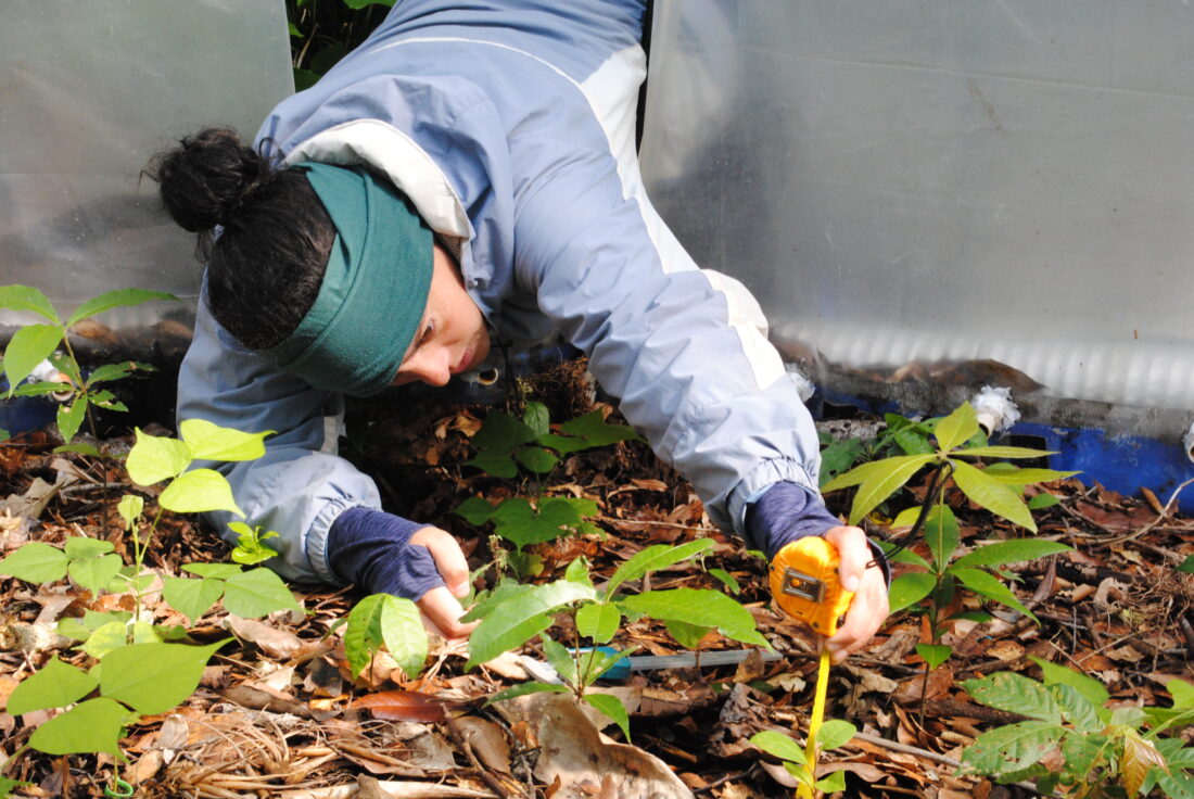 Description: La Dra. Ceci Prada es una ecóloga forestal experta en bosques montanos tropicales. Actualmente es investigadora postdoctoral en el Instituto Smithsonian de Investigaciones Tropicales y está haciendo su trabajo de campo en Chiriquí, en el Parque Nacional Volcán Barú. El enfoque principal de su investigación actual es comprender mejor cómo los bosques tropicales montanos responderán al cambio climático. En esta foto, se la ve en su labor midiendo plántulas de árboles que están siendo cultivadas en un bosque y expuestas a niveles elevados de dióxido de carbono. Los resultados de su experimento nos ayudarán a entender mejor cómo los bosques montanos podrían crecer de manera diferente en el futuro, cuando la atmósfera contenga aún más dióxido de carbono.