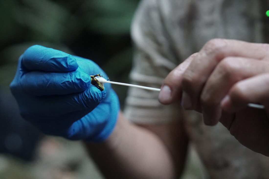 Description: Una de las ultimas poblaciones de Atelopus limosus o Sapo Arlequín Limoso conocidas en el mundo están luchando por sobrevivir en los bosques de Konsenda Panamá. Actualmente científicos de la Fundación Los Naturalistas tratan de entender el declive constante de esta población, desde monitoreos constantes, educación ambiental y la lucha contra el hongo quítrido (Batrachochytrium dendrobatidis).