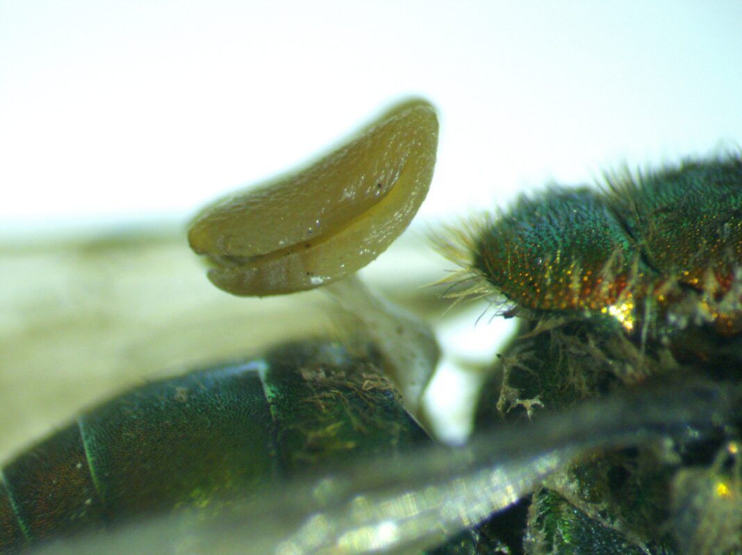 Description: Saco de polen de una orquídea (polinario) adherido a la parte superior del abdomen de una abeja de las orquídeas (Euglossa). Las abejas de las orquídeas, son los principales polinizadores de orquídeas en el Neotrópico. Cuando las abejas visitan las flores, los polinarios, se les pegan en distintas partes de su cuerpo, y al visitar otras orquídeas los depositan, polinizándolas. Microscopio: Amscope SM-2TZZ Objetivo: 10x Zoom: 2.0 Aumento: 20