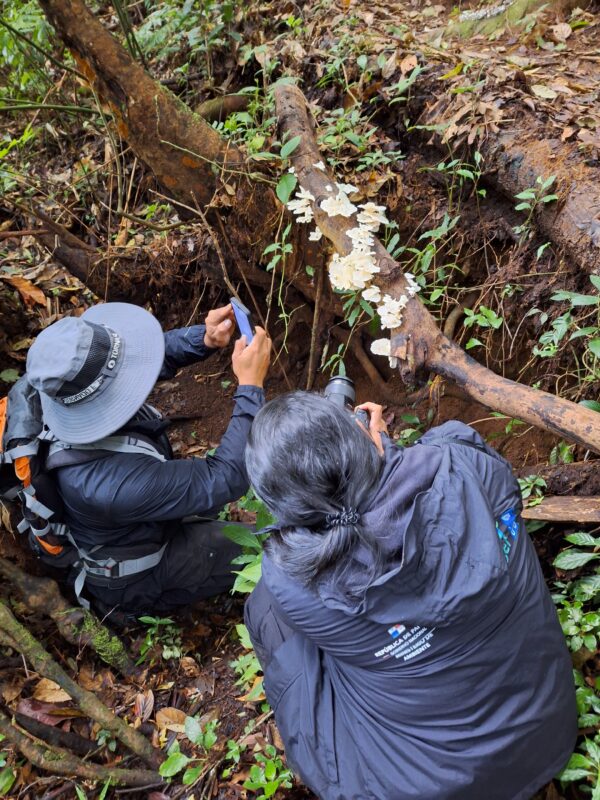 Description: Cuando se piensa en los científicos, lo primero que suele venir a la mente es una persona con bata blanca, rodeada de tubos de ensayo y equipos complejos en un laboratorio. Sin embargo, la investigación científica va mucho más allá de esas cuatro paredes. En esta imagen, podemos ver a dos científicos en plena labor de campo, fotografiando un hongo que será recolectado para estudios posteriores. Esta vez, el objeto de estudio no se encuentra en un plato Petri, sino creciendo de forma natural sobre un tronco en descomposición, en medio del bosque dentro de la hacienda Mamecillos en Boquete, Chiriquí. Esta imagen refleja otro rostro de la investigación científica, uno en que arrodillarse, ensuciarse, caminar por horas y enfrentarse a la intemperie es solo parte del proceso del descubrimiento y de la vida del científico.