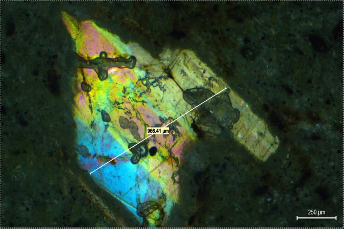 Description: Nicoles Cruzados (XPL) 10x. Escala 250 µm Fenocristal prismático de alta birrefringencia de cristalización secundaria. Equipo: Microscopio de luz polarizada Leica DM 750P. La epidota es un mineral propio de ambientes de alteración hidrotermal en condiciones únicas de temperatura, presión y tiempo. En especifico, esta imagen refleja el proceso laborioso resultante del reemplazo de minerales cálcicos iniciales en las rocas por acción de fluidos termales en contexto volcánico panameño. Esta muestra proviene del sistema termal más antiguo de la región Occidental, el complejo Tisingal. Este hallazgo permite identificar con exactitud el origen y procesos geológicos que dieron paso a la formación de estos sistemas termales y entender que este tipo de estructura es el vestigio final de procesos orogénicos que ocurrieron hace millones de años desde América central hasta Panamá formando cordilleras y volcanes a su paso. Desde la historia de un cristal bajo un microscopio hasta los pozos hirviendo de Silla de Pando, Tierras Altas remanente del pasado geológico único en Panamá.