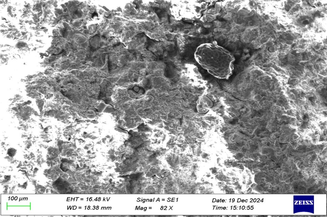 Description: Muestra de roca ígnea extrusiva termal, Silla de Pando. Equipo: Microscopio electrónico de barrido ZEISS EVO Escala100 µm. Cada microorganismo posee un rango de acidez y sustento propio posible de relacionar con el tipo de ambiente hidrotermal de la muestra de Silla de Pando. En esta muestra las capas microbianas consisten en cianobacterias biomineralizadas, intactas, (Methanosarcina sp.), un metanógeno de la familia Euryarchaeota, este tipo de bacteria prospera en ambientes ácidos a ligeramente alcalinos por la metabolización de metano, dióxido de carbono e hidrogeno molecular. Su presencia en el sistema implica que la muestra estuvo expuesta a condiciones anaeróbicas por periodos prolongados asociados a ambientes cerrados y encapsulamiento de sedimentos profundos en rocas. Esto supone que el reservorio correspondiente a la fuente del hidro termalismo del área se encuentra aislado y a gran profundidad. Lo que implica un acuífero confinado que actúa como reservorio de aguas antiguas y asciende a través de fracturas locales abasteciéndose de aguas meteóricas en conjunto del afluente del río Colorado. Un fósil, una historia de ambientes extremos y un sistema hidrotermal antiguo; pequeños hallazgos son los que implican mayor impacto y nos permiten entender que la historia también se cuenta desde perspectivas microscópicas.