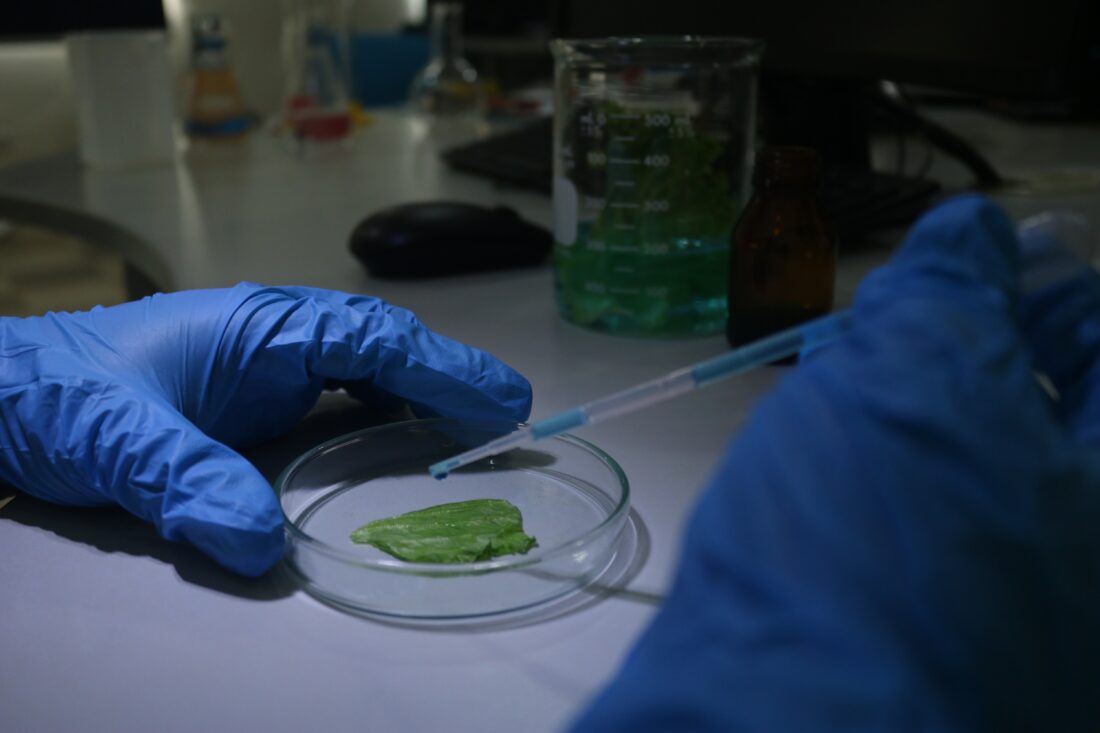 Description: Fotografía del estudio del transporte y absorción de nutrientes a través del xilema y la membrana de la hoja de Lactuca Sativa L. Var. Longifolia (lechuga romana). En el primer plano se observa el momento donde las manos de la investigadora manipulan la muestra de hoja de lechuga en una placa de Petri, utilizando una pipeta de precisión para realizar goteo controlado sobre la membrana. En el fondo, la cristalería y los demás componentes líquidos (colorantes y nutrientes de diferente densidad molecular), resaltan la multiplicad de factores y la complejidad de los procesos de investigación. La iluminación baja y enfocada, resalta la concentración y el nivel de cuidado de la investigación, demostrando la rigurosidad requerida en la experimentación científica.