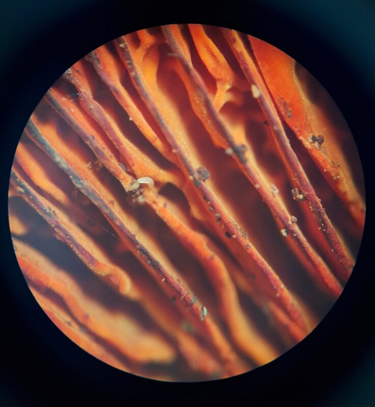 Description: Los hongos no solo son descomponedores esenciales en los bosques, también son microhábitats donde florece la vida invisible. Bajo el lente del estereoscopio, este pequeño hongo naranja perteneciente al género Marasmius spp., revela un ecosistema que el ojo humano no percibe. Entre sus láminas habitan diminutos gusanos transparentes, probablemente nematodos o larvas de mosquitas de hongo, que se alimentan y encuentran un hogar en su tejido. Lo que a simple vista parece un simple sombrerito en el bosque es, en realidad, un microecosistema lleno de interacciones ocultas. Equipo utilizado: Estereoscopio binocular. Escala: 2x