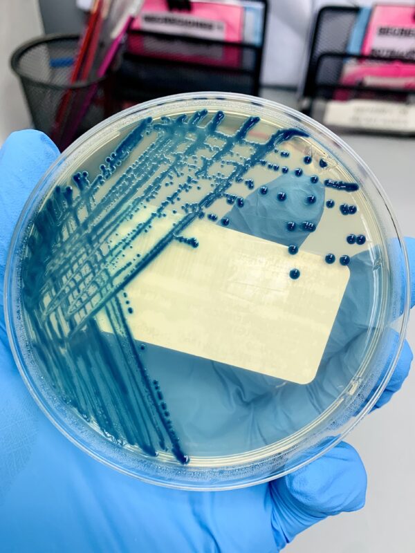 Description: El agar cromogénico muestra el espectáculo de pasar de lo invisible a lo visible, colonias bacterianas de color azul intenso indicando BLEE positivo. BLEE, Betalactamasas de Espectro Extendido son enzimas bacterianas que confieren resistencia a antibióticos betalactámicos lo que pone en riesgo a las personas por tener menos fármacos disponibles para tratar las infecciones. Entre los años 2010 y 2011 lo hermoso del azul se convierte en una pesadilla que sacudió los hospitales de la ciudad de Panamá; porque las bacterias resistentes a los antibióticos acabaron con la vida de muchos pacientes. Es ahí donde el laboratorio clínico con experticia detecta lo que se escapa a simple vista: resistencias. Estudiar el comportamiento de estas bacterias ayuda a los científicos a buscar nuevos fármacos o métodos alternativos de tratamiento, además, su investigación contribuye de forma positiva al sistema de vigilancia global de la OMS contribuyendo con su base de datos. La resistencia a los antimicrobianos (RAM) está siendo considerada por expertos internacionales como la próxima pandemia silenciosa, una amenaza actual que requiere atención.