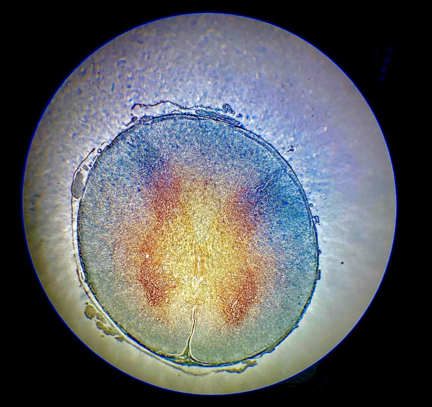 Description: Imagen de un corte transversal de médula espinal observada mediante microscopio óptico a 4x. En el centro se localiza el canal ependimario, rodeado por la sustancia gris con forma de mariposa, que se organiza en astas dorsales (posteriores) y astas ventrales (anteriores). La sustancia blanca se encuentra en la región periférica, y se diferencia de la gris por su coloración más clara. Esta imagen permite identificar con claridad la disposición general de las estructuras internas de la médula espinal y resulta útil para el estudio básico del sistema nervioso central.