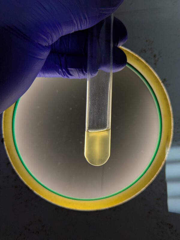Description: Una nube blanca y etérea se extiende por el tubo de ensayo, ilustrando la motilidad en forma de sombrilla de Listeria monocytogenes. Esta característica única, visible en el medio SIM a 20-25°C, revela el movimiento de la bacteria que busca la temperatura ideal, creando un impresionante patrón que parece florecer en las profundidades del gel. Un delicado recordatorio de la compleja vida invisible que nos rodea.