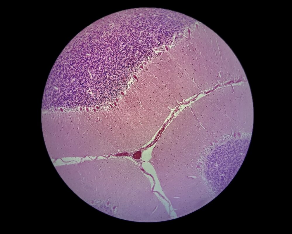 Description: Imagen de un corte sagital del cerebelo observada mediante microscopio óptico con un aumento de 10x. Se identifica la sustancia blanca, que se ramifica hacia la periferia formando el árbol de la vida cerebeloso (arbor vitae), rodeada por la sustancia gris cortical, organizada en tres capas: capa molecular, capa de células de Purkinje y capa granular.