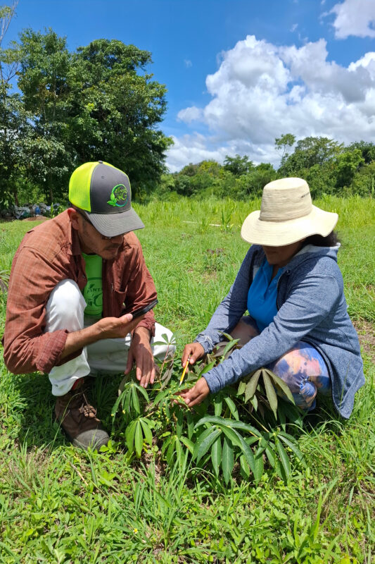 Description: Capital humano profesional evalúan el impacto de la plaga de agallas en plantaciones de yuca, un tubérculo fundamental para la seguridad alimentaria en muchas regiones tropicales. El estudio busca identificar los daños causados por esta plaga y proponer soluciones sostenibles para mitigar su efecto en la producción. La investigación en campo, como la que se muestra en esta imagen, permite generar datos clave para mejorar el manejo integrado de plagas, proteger los cultivos y fortalecer la resiliencia agrícola frente al cambio climático. La ciencia aplicada al agro es esencial para garantizar alimentos sanos y abundantes.