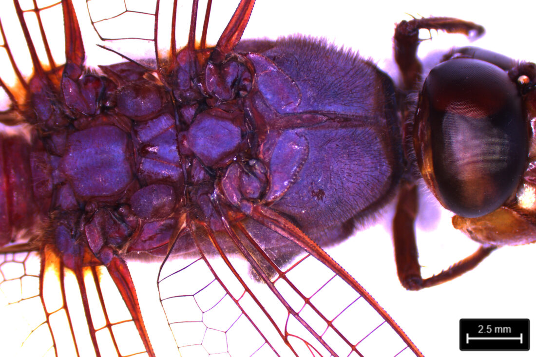 Description: Bajo el lente de un estereoscopio, se revela la complejidad estructural de una libélula del orden Odonata, caracterizada por una pigmentación violeta iridiscente en el tórax y el abdomen. Esta imagen fue capturada tras un evento de mortandad a orillas de la carretera Panamericana, donde cientos de individuos aparecieron sin vida en un mismo tramo. La fotografía documenta no solo la belleza morfológica del insecto —con sus ojos compuestos multifacéticos, alas membranosas con venación reticulada y patas adaptadas para la captura aérea— sino también plantea interrogantes ecológicos sobre los factores que podrían haber provocado este fenómeno: contaminación lumínica, agroquímicos, alteraciones térmicas o cambios en los patrones migratorios. Esta imagen busca ser un testimonio visual de la fragilidad de los ecosistemas y la urgencia de monitorear eventos biológicos inusuales como indicadores de desequilibrio ambiental. Escala: 2.5 mm Equipo: Leica Ivesta 3