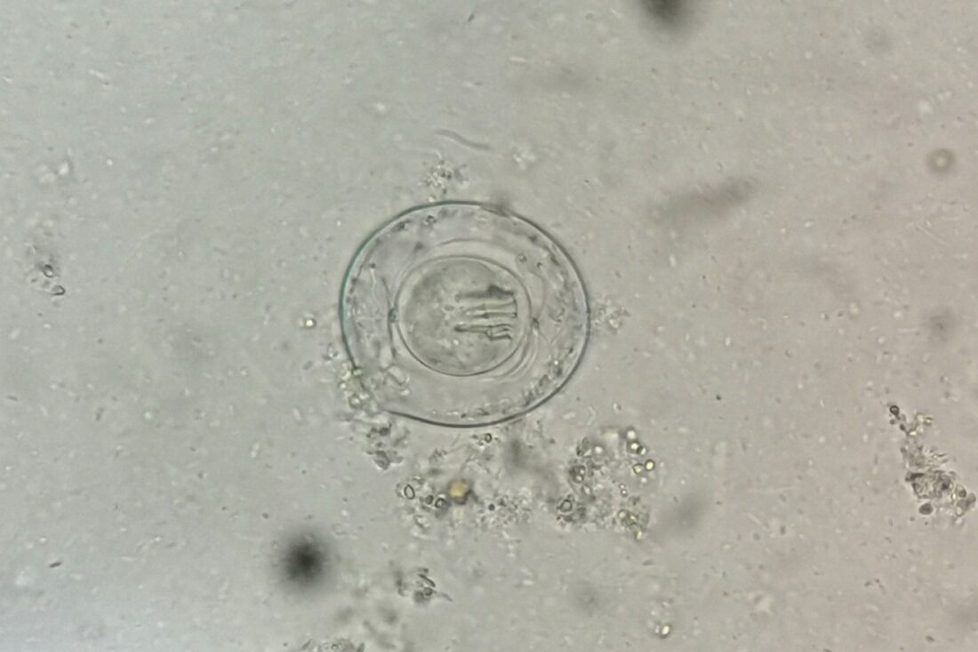Description: Rodeado por una membrana perfectamente delineada, observamos un huevo del más pequeño de los céstodos humanos: Hymenolepis nana. Es visible las estructuras características como los filamentos en forma de mechón que salen de los polos de la membrana interna y en el interior la oncosfera provista de tres pares de ganchos. Este huevo no solo es una evidencia diagnóstica, sino un testimonio de adaptación biológica en su máxima expresión. Su simetría, translucidez y detalles internos lo convierten en una joya microscópica que combina ciencia, arte y complejidad evolutiva. Lo que parece una esfera minúscula es, en realidad, el principio de una interacción silenciosa entre huésped y parásito, es aquí donde la parasitología cobra vida ante nuestros ojos. Fotografía tomada en el Laboratorio de Microbiología, Universidad Autónoma de Chiriquí. Equipo utilizado: Microscopio óptico marca Numak, modelo XSZ 107 BN. Objetivo de 40x. Escala: entre 30 y 47 μm de diámetro.