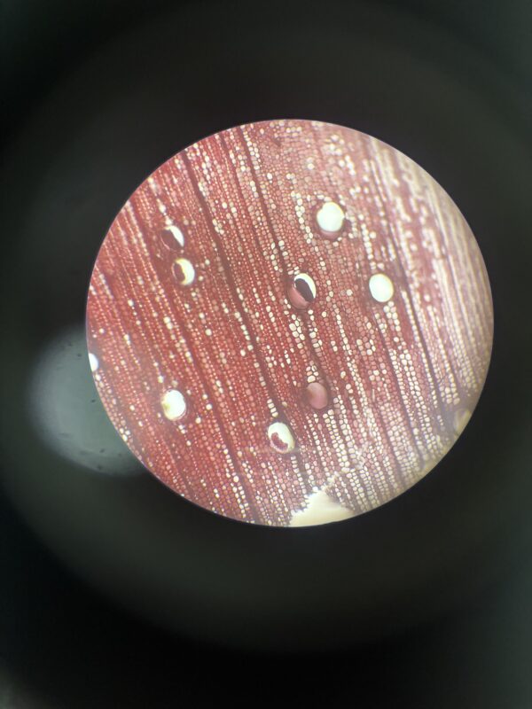 Description: Microscopio óptico objetivo 10x Imagen microscópica de un corte transversal de madera, donde se aprecian vasos conductores y el parénquima estas estructuras anatómicas son clave para comprender la fisiología y adaptaciones de las especies vegetales.