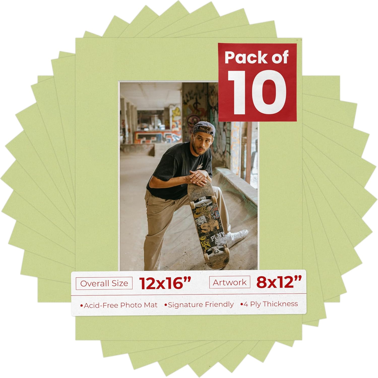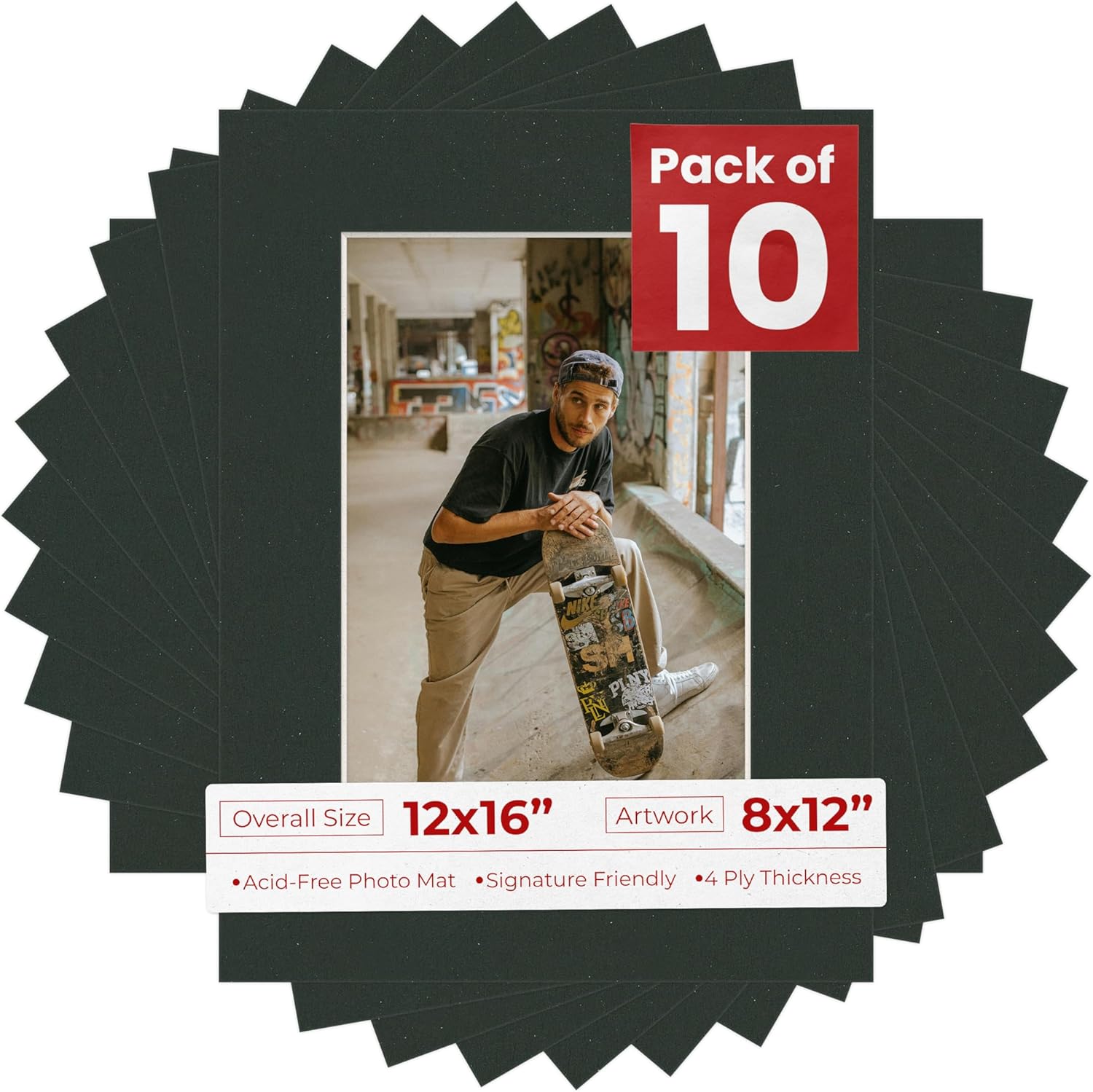 THIS IS FOR A PACK of 10 Mats WITH Acid Free Backing Boards and Self-Seal Crystal Clear Bags, Featuring a picture opening for a 8x12 inch photo, and a 12x16 inch overall size. Picture openings are cut 0.5" smaller than the photo size advertised to overlap the photo and help keep it securely in the frame. MADE TO DISPLAY a 8x12 Photo and fit in a standard 12x16 Picture Frame. Great replacement for damaged, dirty, or faded matting in your old frames. PREMIUM QUALITY: Our precut photo matboards are acid free & precision cut with a 45 degree bevel by machine for perfect corners and NO over-cuts every single time! PRECUT ACID-FREE MATTE BOARD COLOR is a vibrant White. All of our Precut Matboards are proudly MANUFACTURED IN THE USA.