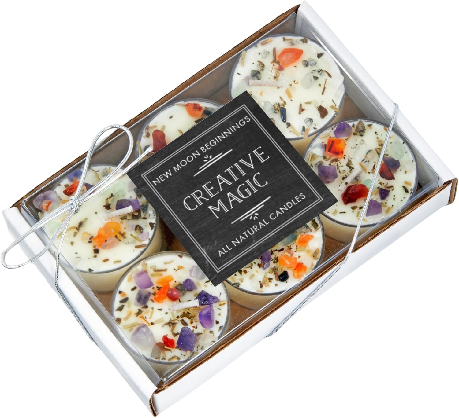 Our Creative Magic Candle is made to cultivate and multiply your creative energy. Clear your mental blockages and manifest an abundance of creativity! It will clear your head of mental fatigue and aid in memory and concentration. The Creative Magic Candle has a Minty, Herbal, Fresh, and Citrusy scent with Carnelian, Fluorite, Amethyst, and Tourmalinated Quartz healing crystals on top. Handmade and Hand-poured with Soy Wax for a Long, Clean Burn!This listing is for a single (1) New Moon Beginnings Candle container or pack of tealights. New Moon Beginnings Candles are Handmade and Hand-poured in the USA. We use 100% Natural Soy Wax, Essential oils, Natural Fragrance Oils, and 100% Cotton Wicks (Lead-Free). Each candle is topped with Genuine Crystals and Stones, flowers, and herbs which are all mindfully selected to help set the intention of the candle.Size Options include: Tealights in a set of 6: Each Tealight is .75" tall and 1.5" in diameter7.5 oz. Glass Jar: 3 inches high and ~2.75 inches in diameter8 oz. Tin with lid: 2 inches high and ~3 inches in diameter12 oz. Glass Jar with lid: 3.5 inches high and ~3.25 inches in diameter21 oz. Glass Jar with lid: 6.25 inches high and ~3 inches in diameterBURN TIMES: Tealights: 4 to 6 hours per tealight7.5 oz: 20 to 30 hours8 oz: 20 to 30 hours12 oz: 40 to 60 hours21 oz: 80 to 100 hours