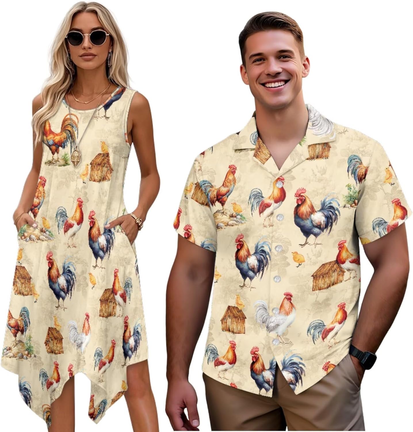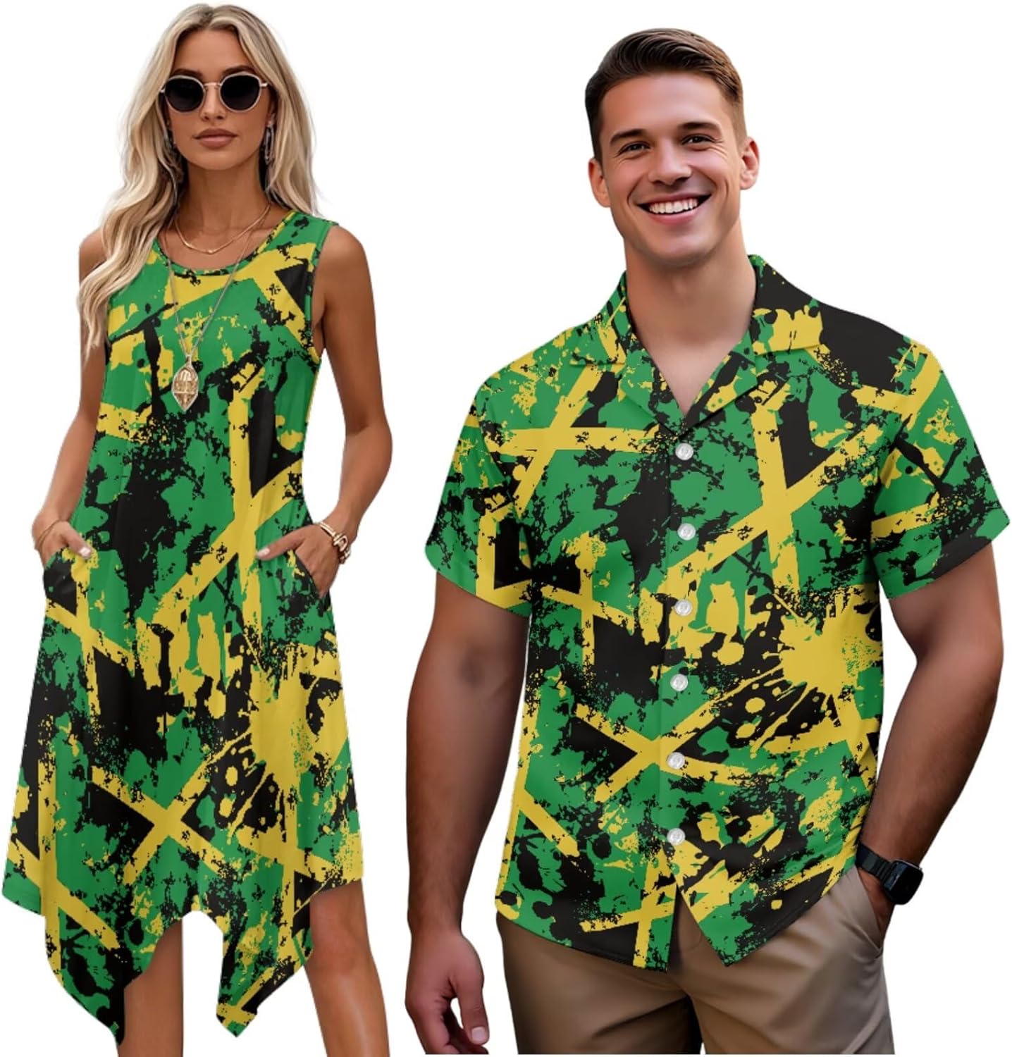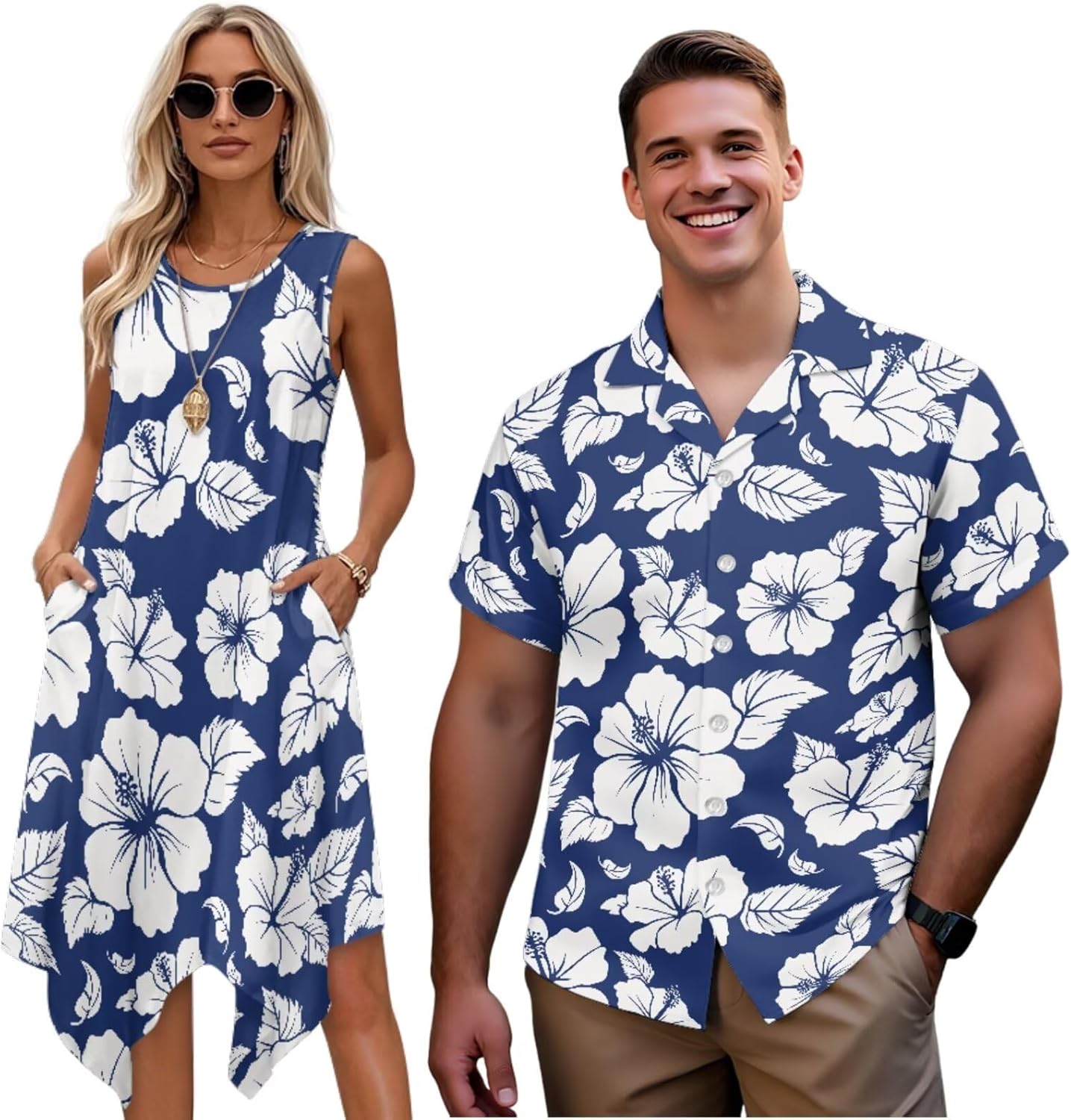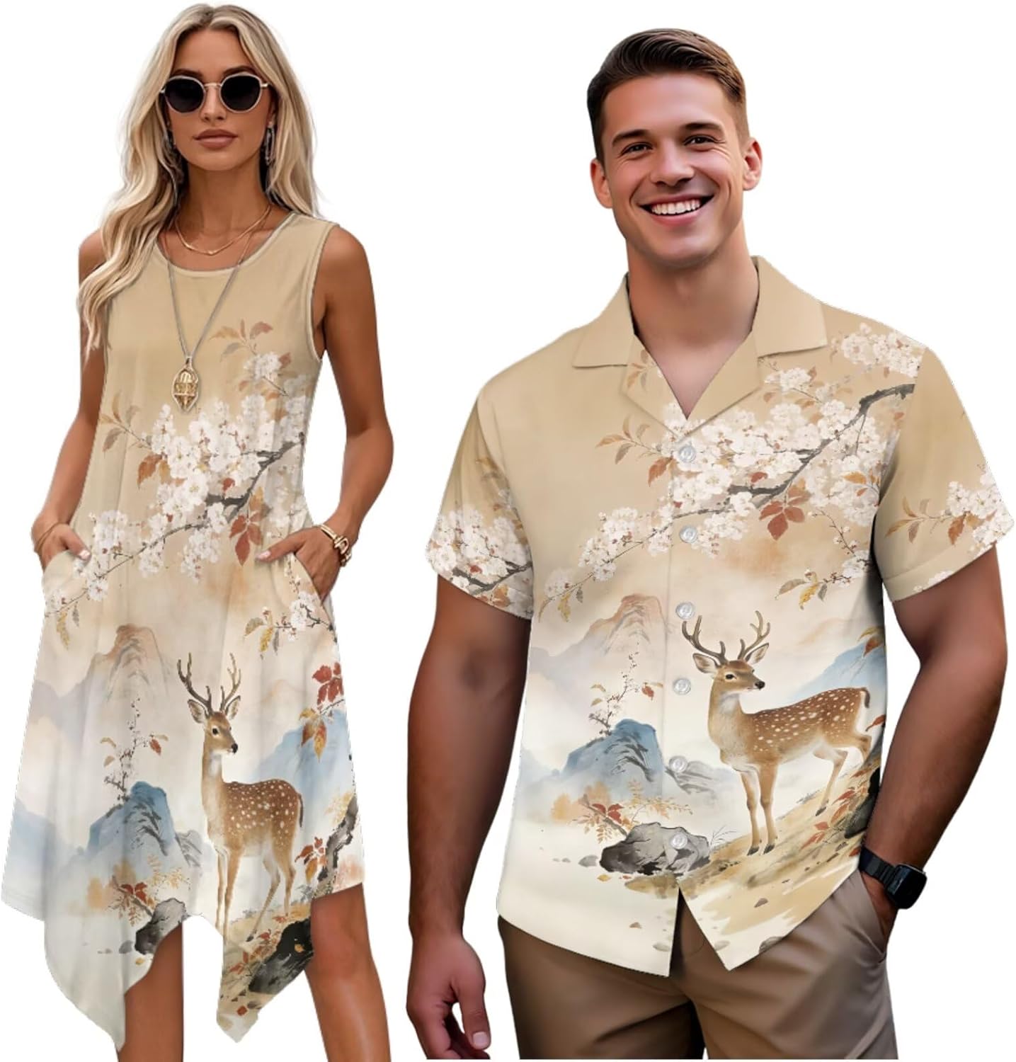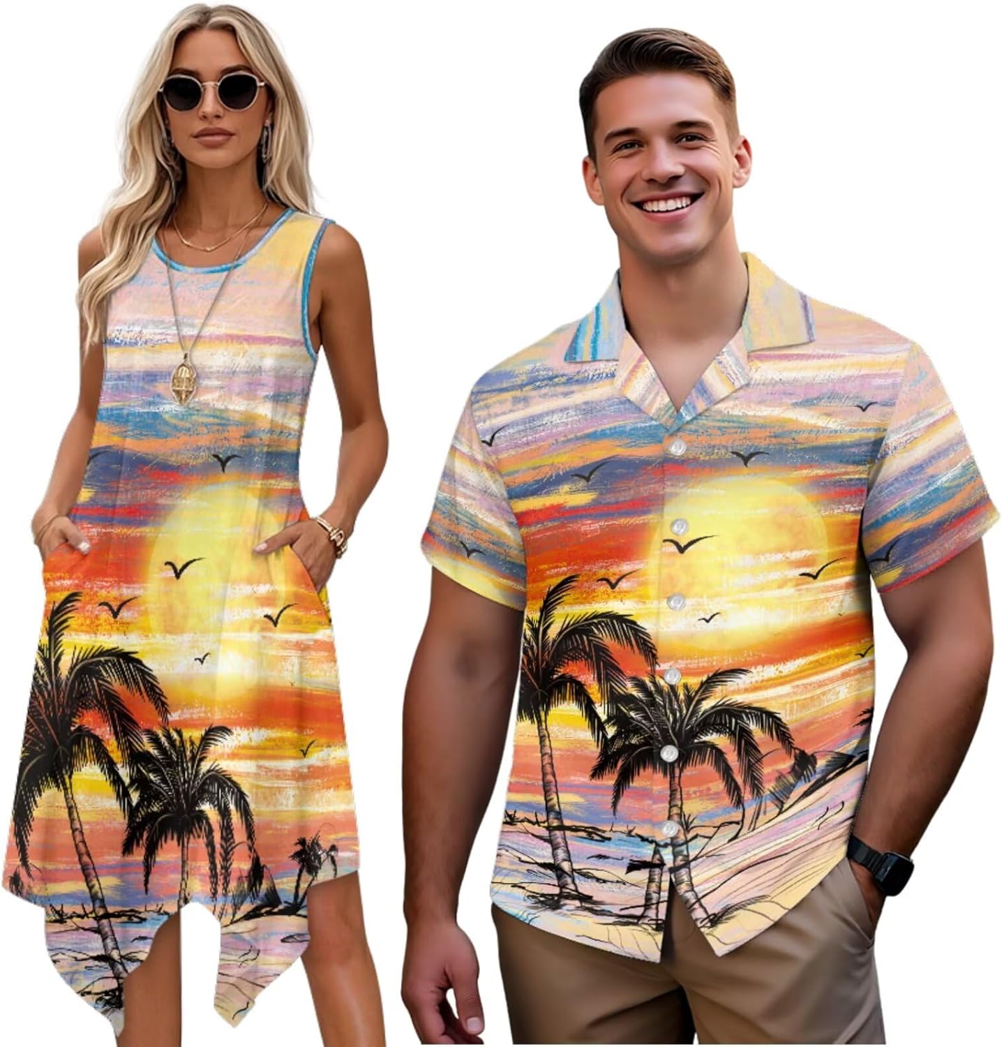 Couple Matching Outfits: Men's Short Sleeve Button Down Shirt & Women's Tank Midi Dress Elevate your couple style with our coordinated outfit set, blending comfort and harmonious aesthetics. It's perfect for beach vacations, romantic dates, casual gatherings, or couple photoshoots—effortlessly stylish and comfy all day. Coordinated Design Details Subtle matching elements for timeless style: Men's shirt features classic turn-down collar, full button closure. Women's midi dress has a flattering round neck, flowing A-line asymmetrical sundress. Versatile Fit & Occasions Regular fit for men (2XS-7XL) and stretchy adjustable waist for women (XS-4XL), fitting most body types (check size chart). Perfect for beach trips, date nights, family gatherings, anniversaries, Valentine's Day or couple photoshoots. More than clothing—this set symbolizes your connection, eliminating matching hassle. Premium materials, craft and style make it a great choice for yourselves or as a couple gift. Embrace matching style with your loved one; add to cart today!