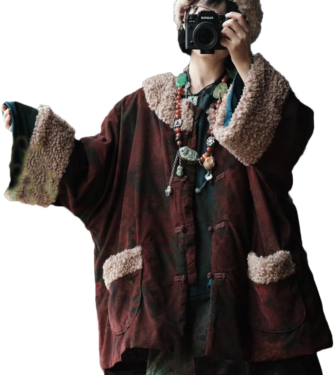 This vintage-inspired women's quilted jacket brings together timeless style and cozy comfort for the colder months. Featuring an oversized, relaxed fit that layers beautifully over your favorite sweaters and tunics, this winter coat is designed to keep you warm while making a fashion statement. The jacket showcases distinctive printed patterns that add character and visual interest, making each piece unique. Luxuriously soft sherpa fleece adorns the collar, cuffs, and pockets, providing extra warmth where you need it most while creating an eye-catching textural contrast. The quilted construction offers superior insulation without adding bulk, and the practical front pockets are perfect for keeping your hands warm or storing small essentials. The button-front closure ensures easy wear, while the generous cut allows for comfortable movement and versatile styling options. Whether you're running errands, meeting friends for coffee, or enjoying outdoor winter activities, this jacket combines vintage charm with modern functionality. Pair it with jeans and boots for a casual look, or layer it over dresses for an eclectic, bohemian vibe. This statement piece is perfect for anyone who appreciates distinctive outerwear that stands out from the crowd.